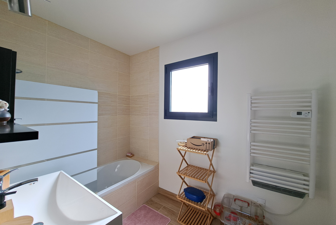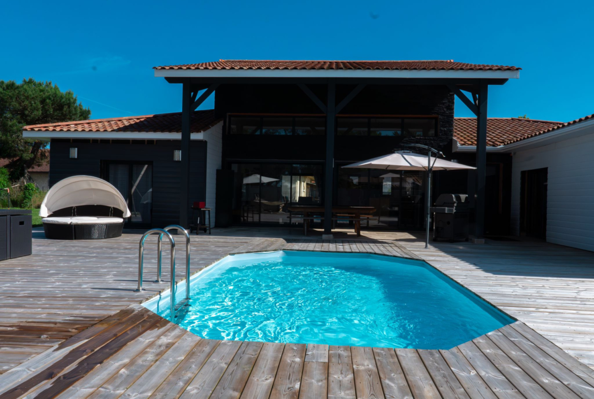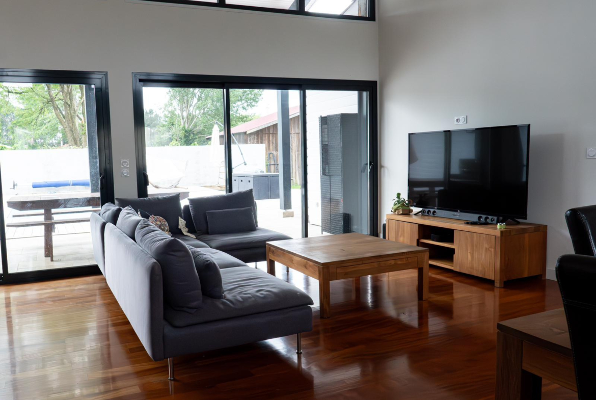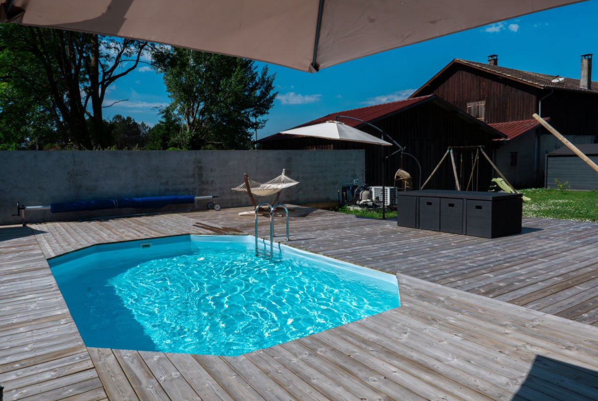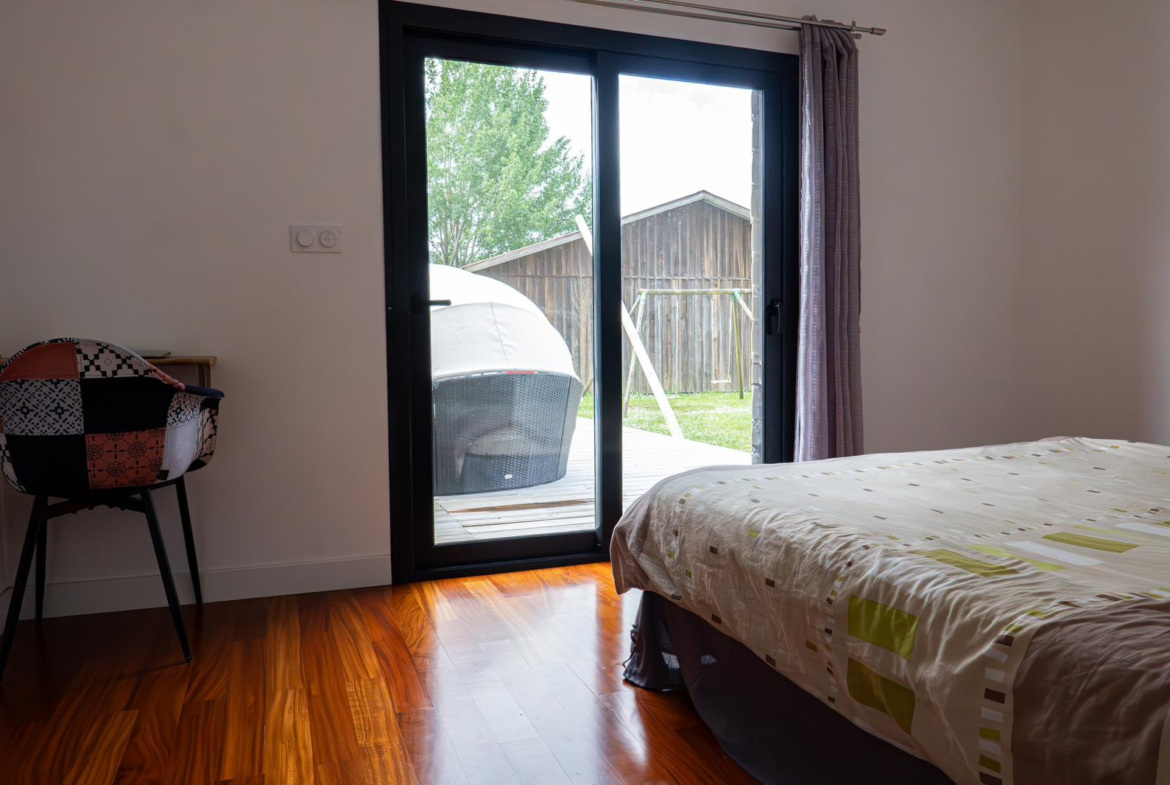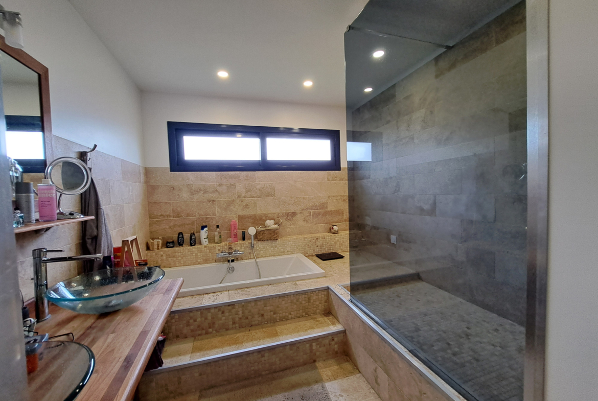 La maison se compose de 4 chambres, dont une suite parentale avec salle de bain en travertin comprenant baignoire, douche et WC.La grande pièce de vie, particulièrement lumineuse grâce à de larges ouvertures, s’ouvre sur une vaste terrasse en bois avec piscine intégrée et un coin jacuzzi, idéal pour se détendre en toute saison.La terrasse est complétée par un aménagement soigné comprenant barbecue, transats, hamac et balançoire.