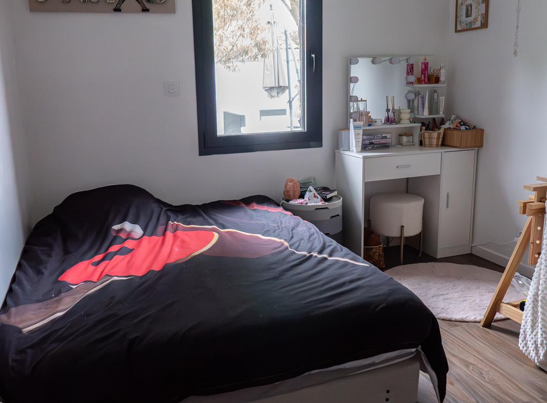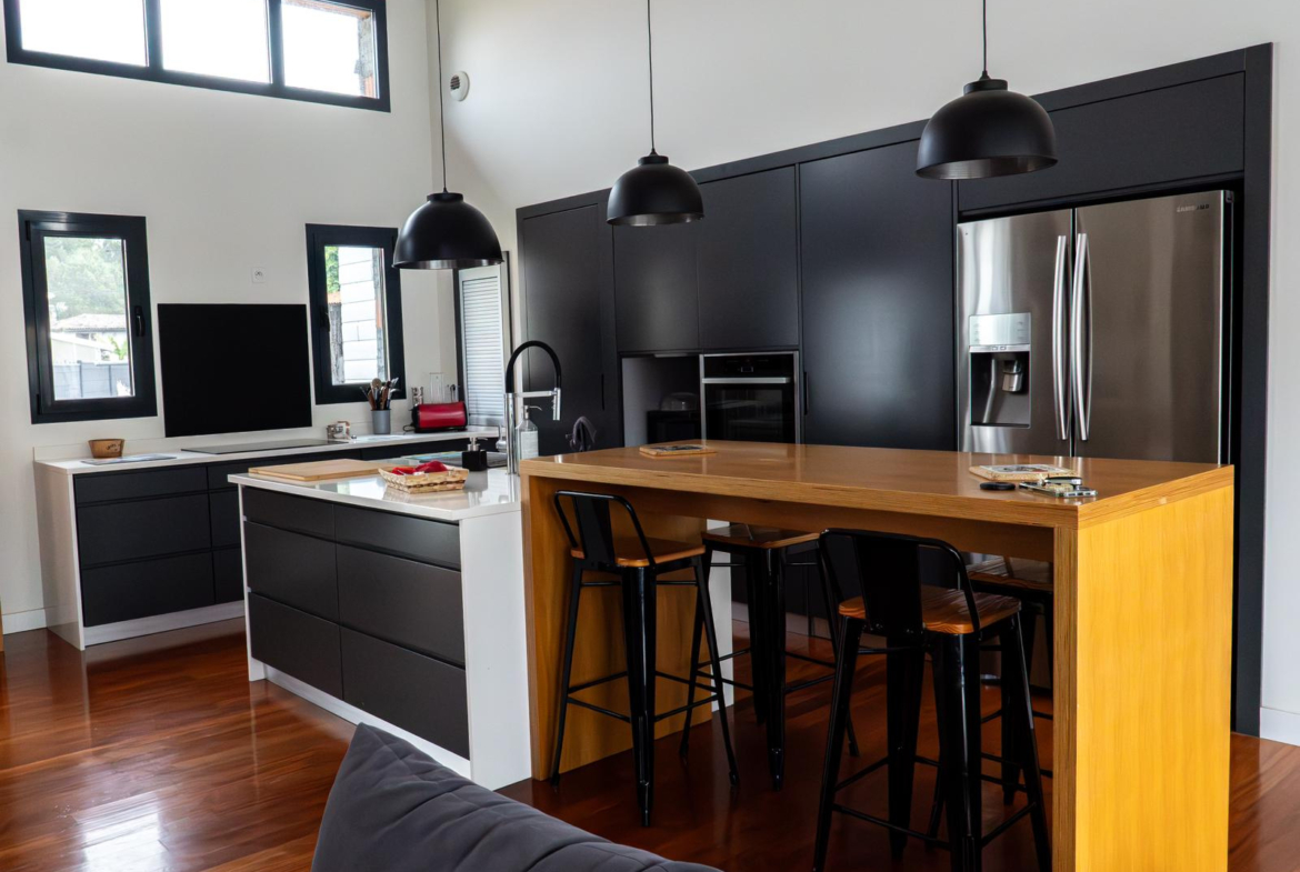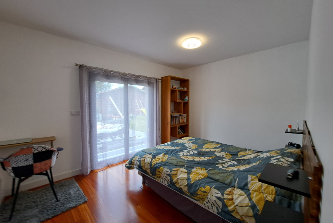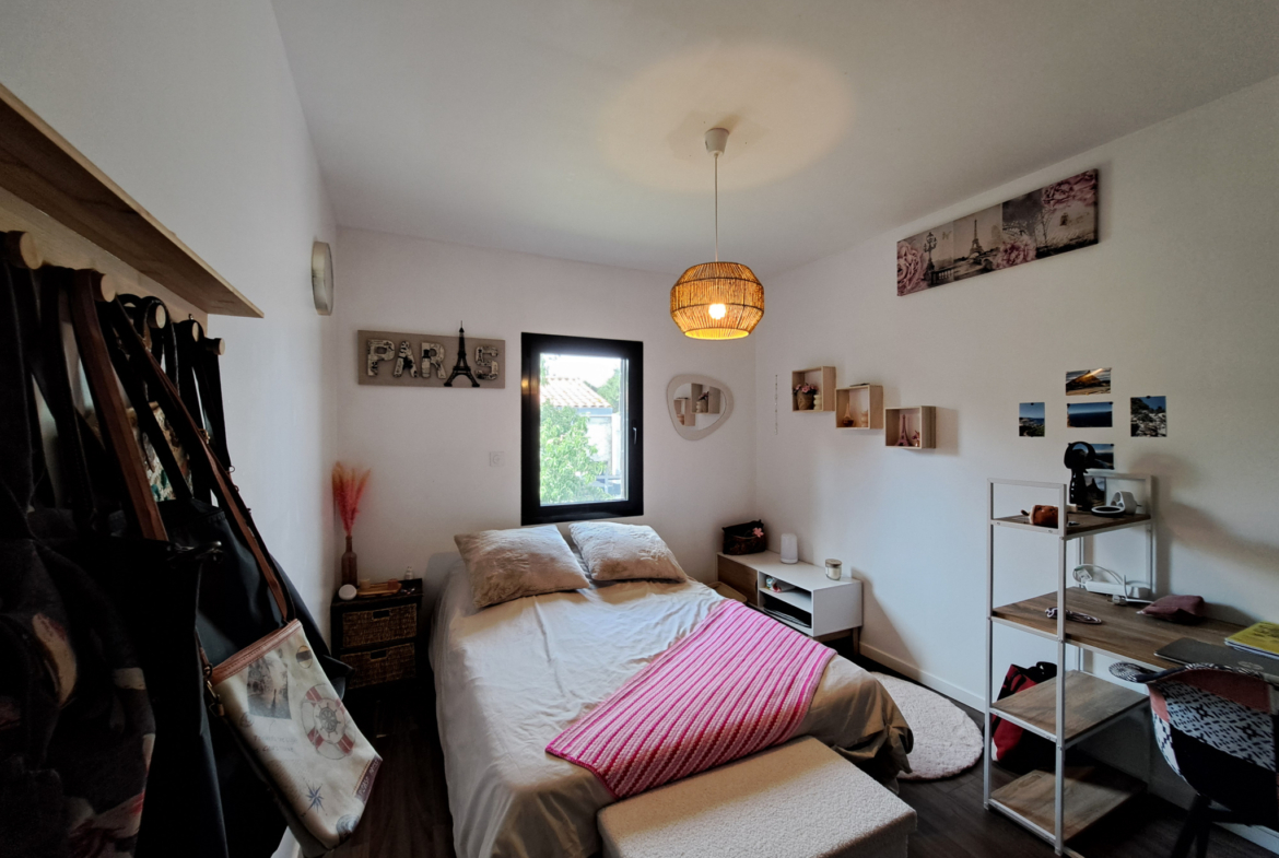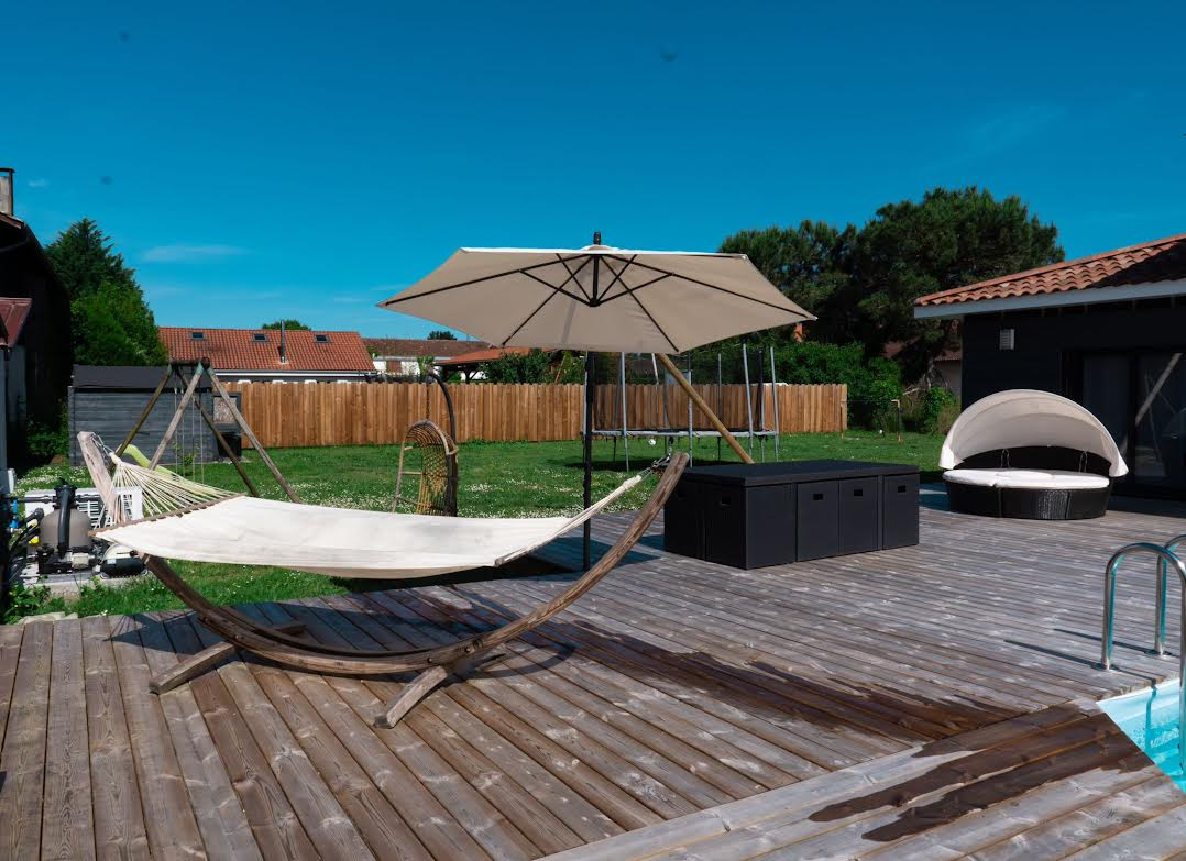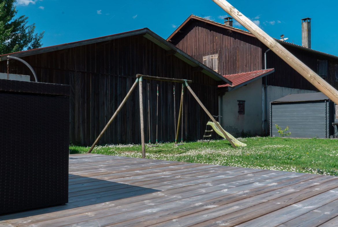 La maison se compose de 4 chambres, dont une suite parentale avec salle de bain en travertin comprenant baignoire, douche et WC.La grande pièce de vie, particulièrement lumineuse grâce à de larges ouvertures, s’ouvre sur une vaste terrasse en bois avec piscine intégrée et un coin jacuzzi, idéal pour se détendre en toute saison.La terrasse est complétée par un aménagement soigné comprenant barbecue, transats, hamac et balançoire.