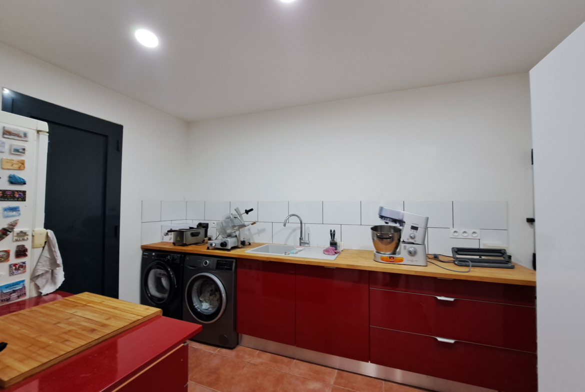 La cuisine moderne est entièrement équipée et bénéficie d’un cellier ainsi qu’une arrière-cuisine.L’ensemble de la maison est habillée d’un véritable parquet, apportant chaleur et élégance.