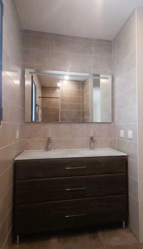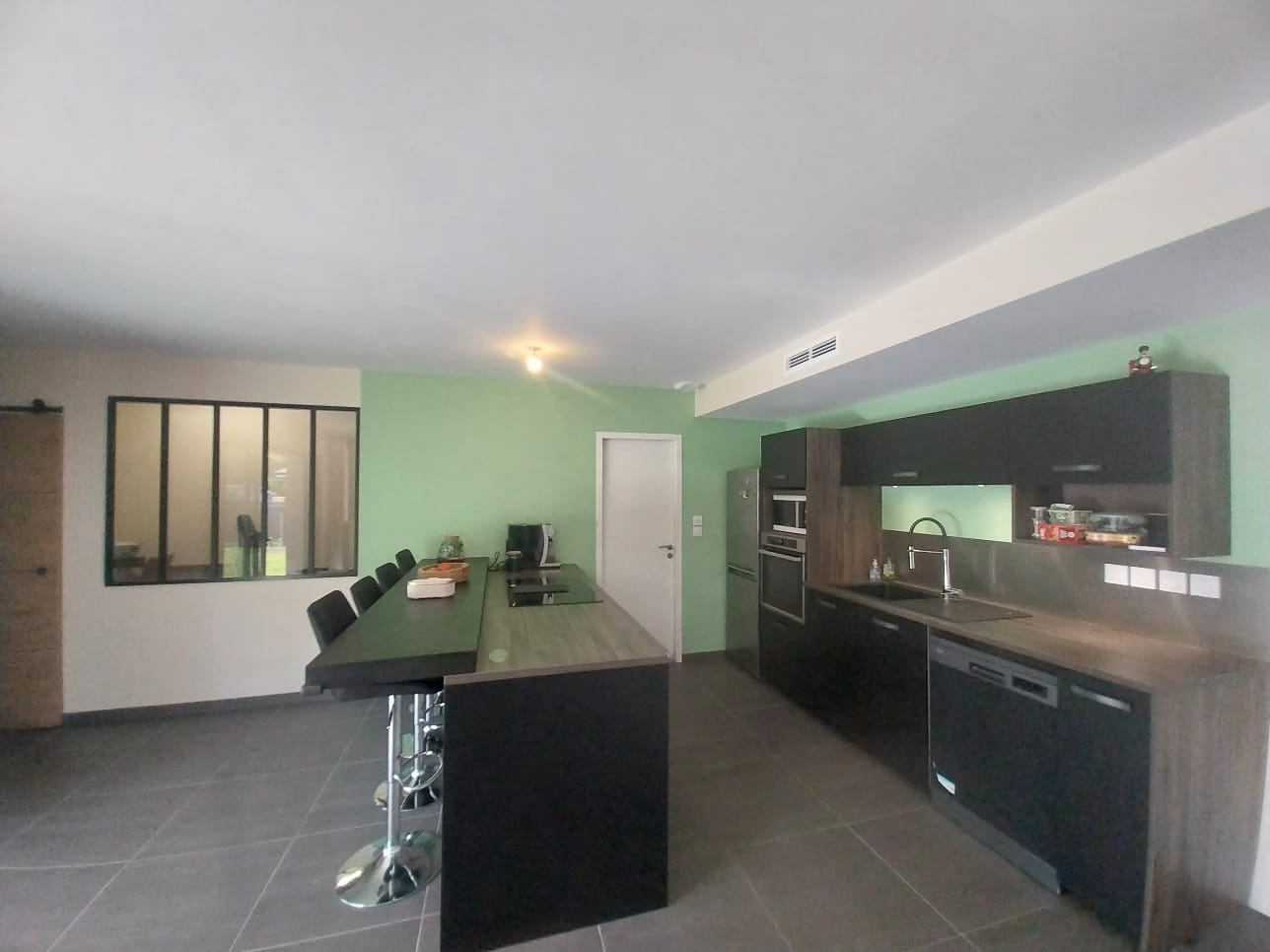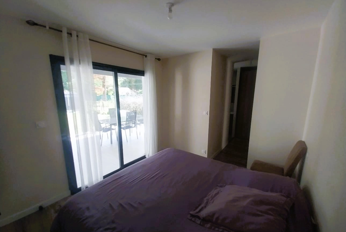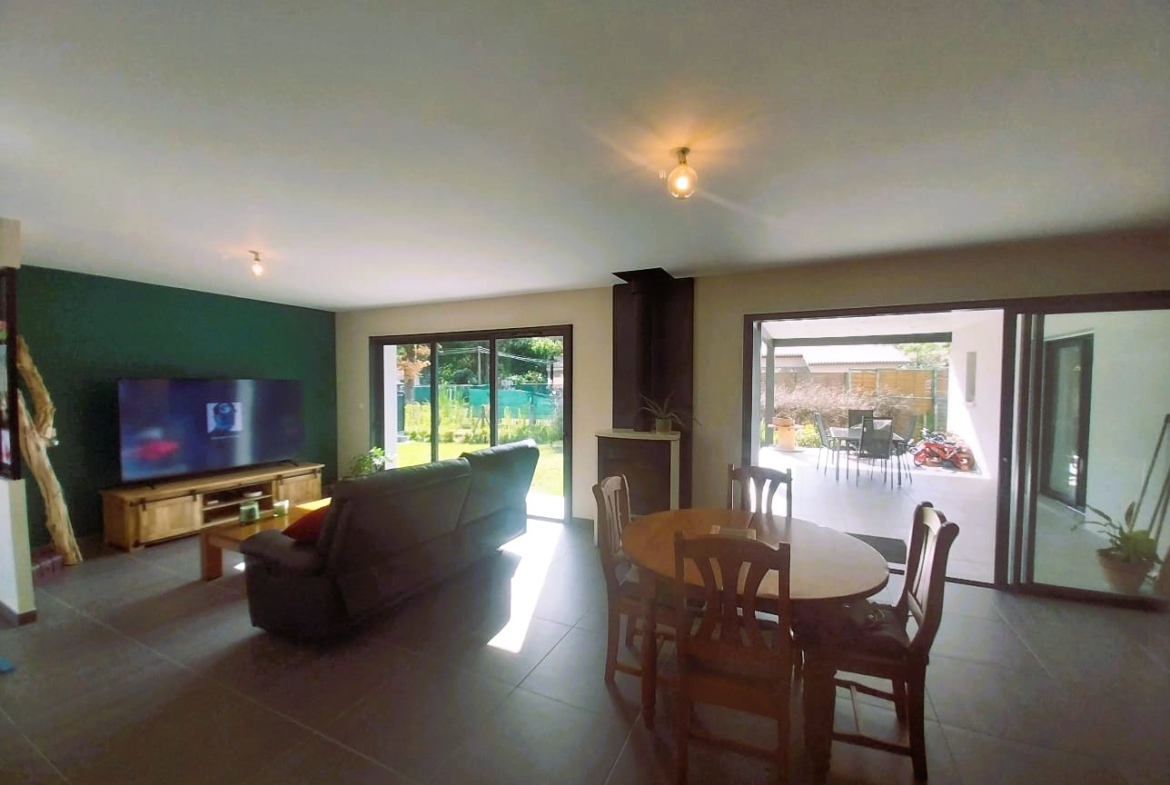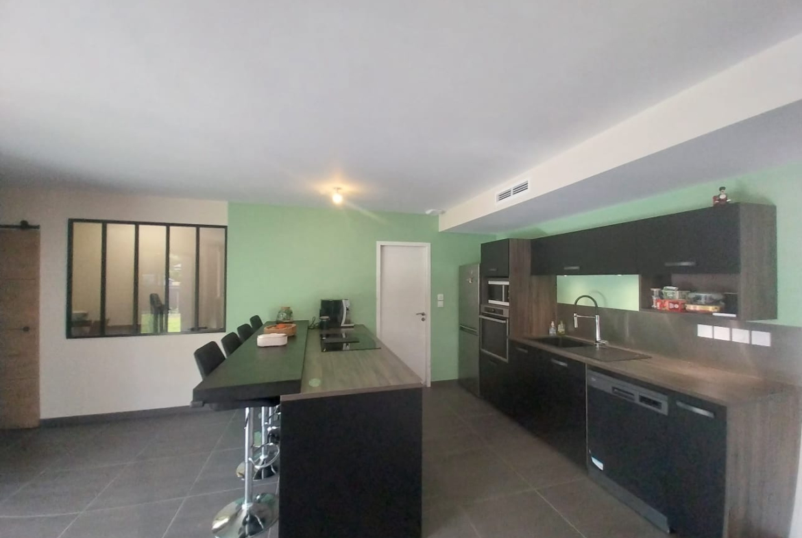 Vous entrerez dans une grande pièce de vie lumineuse avec cuisine ouverte, un coté bar pour des moments conviviaux et un accès direct à la terrasse de plus de 30m2 et au jardin, parfait pour vos moments en famille ou entre amis.