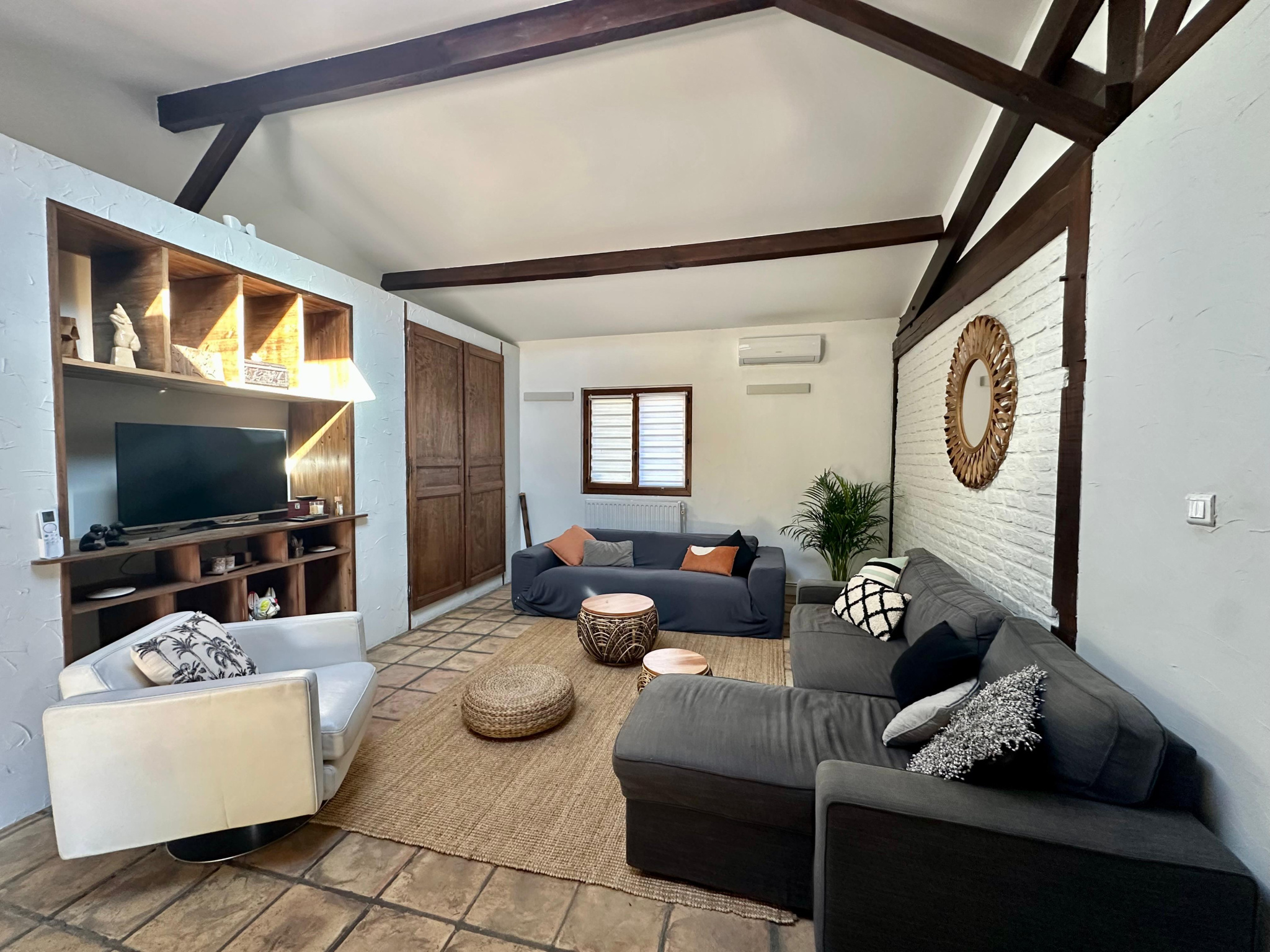 Le rez-de-chaussée s’ouvre sur une atmosphère douce et accueillante. Le séjour et la salle à manger invitent naturellement à la convivialité : le bois, les murs en briquettes et l’insert créent un cocon chaleureux, une ambiance où l’on se projette instantanément. La cuisine ouverte, parfaitement intégrée, devient le coeur de la maison. Plus loin, une première chambre, avec sa salle d’eau privative, permet une vraie vie de plain-pied.
