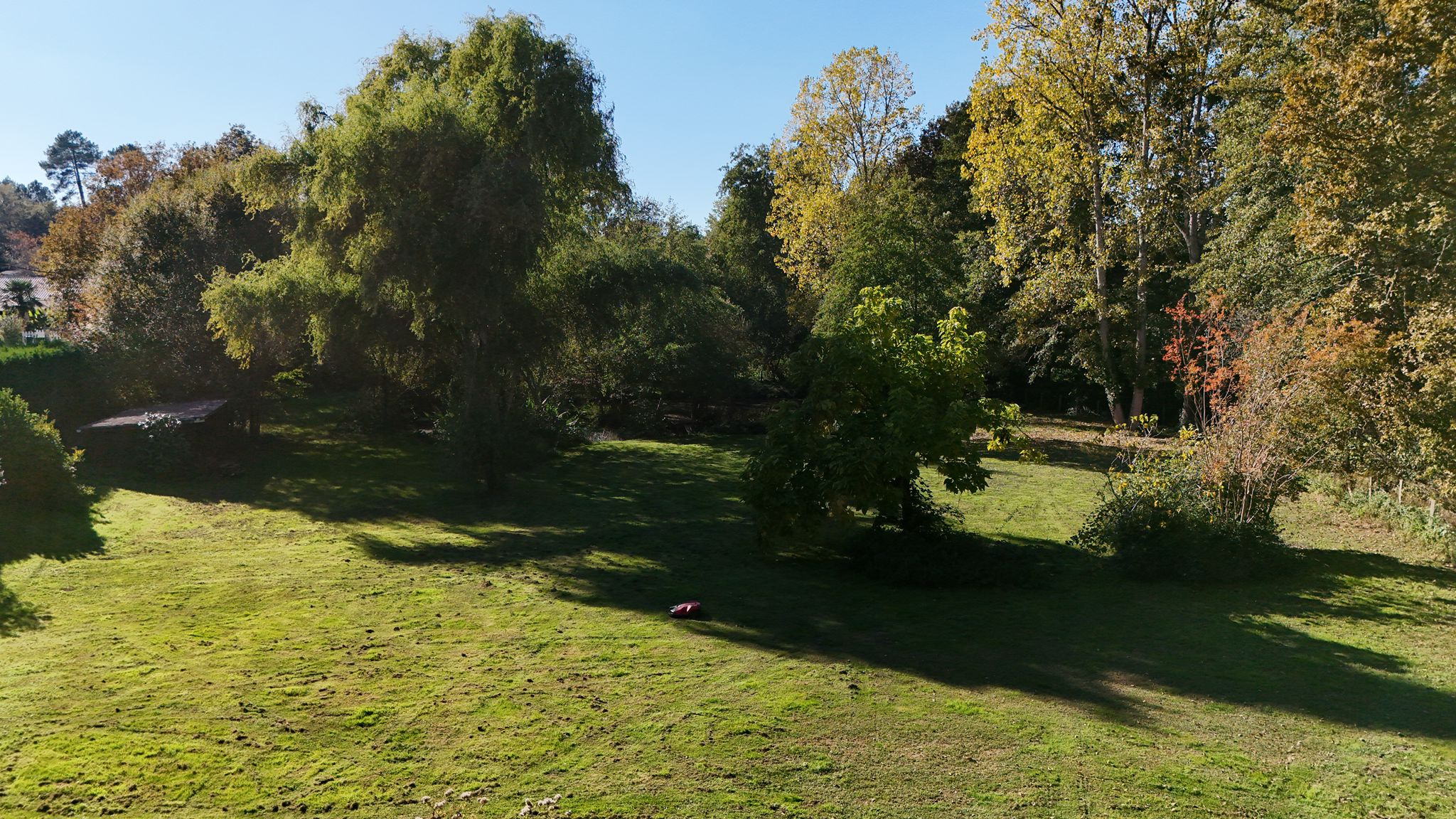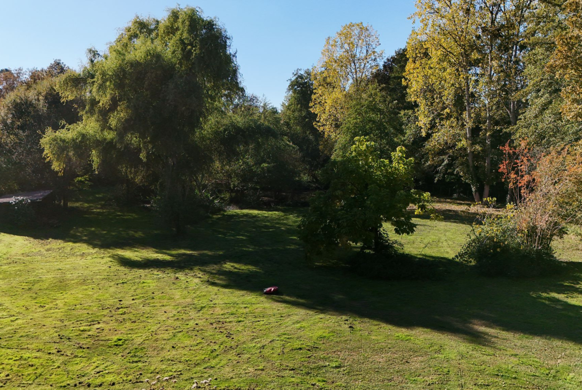 Depuis les pièces de vie, les regards convergent naturellement vers l’extérieur. Une terrasse, en partie couverte, prolonge la maison et vous mène vers la piscine, avec en toile de fond un parc paisible. Le ruisseau qui le borde et l’étang qu’il alimente apportent une véritable dimension naturelle, presque poétique, au lieu.