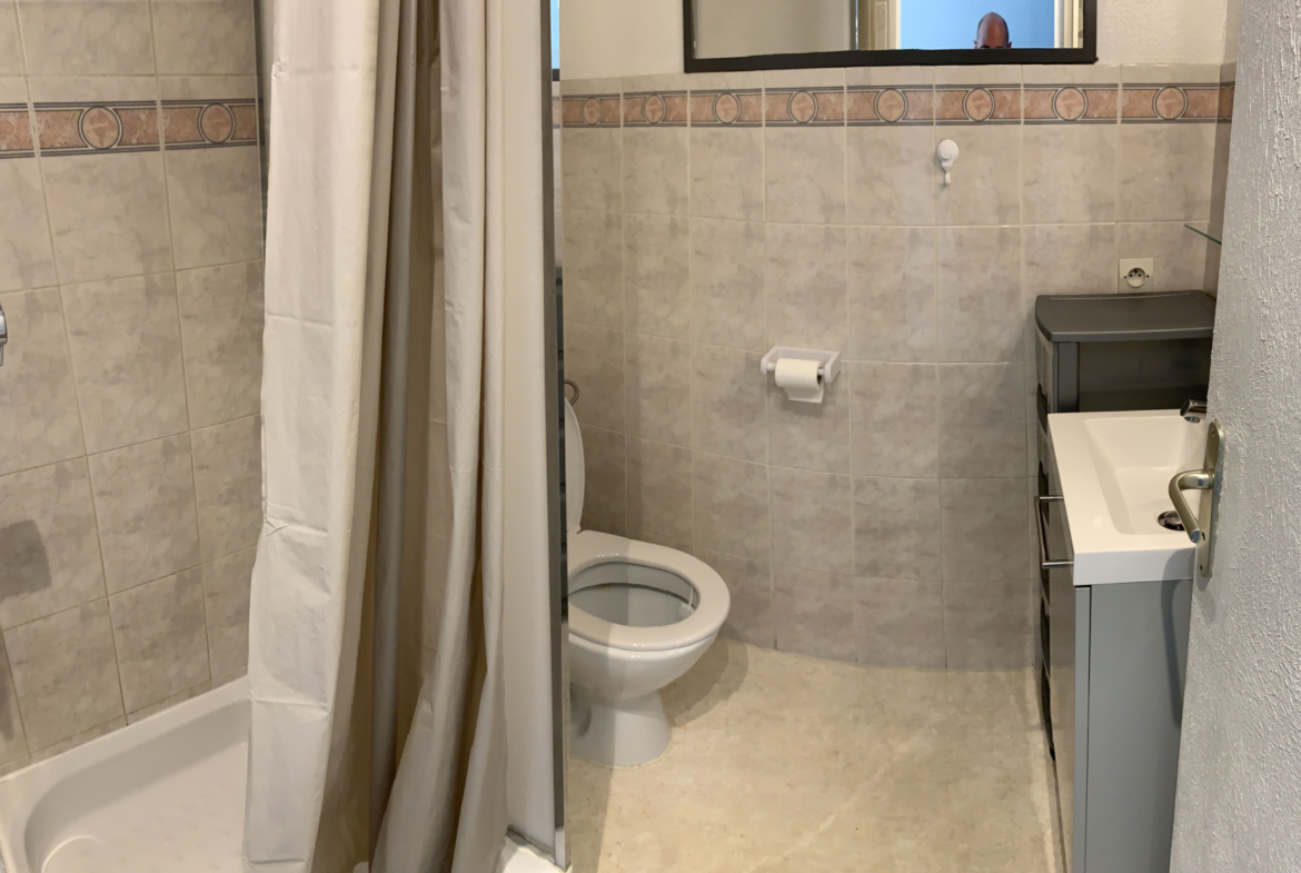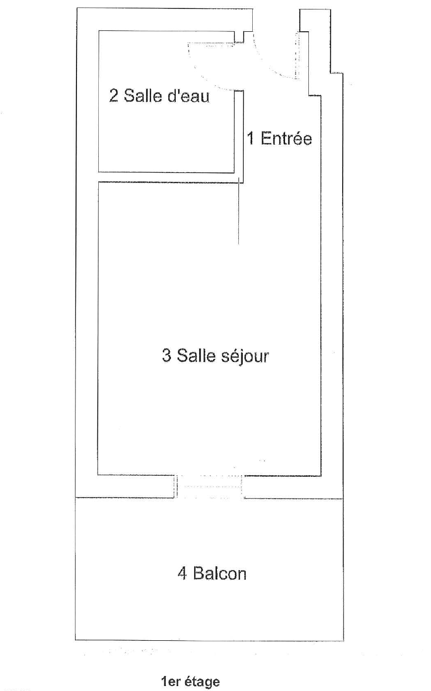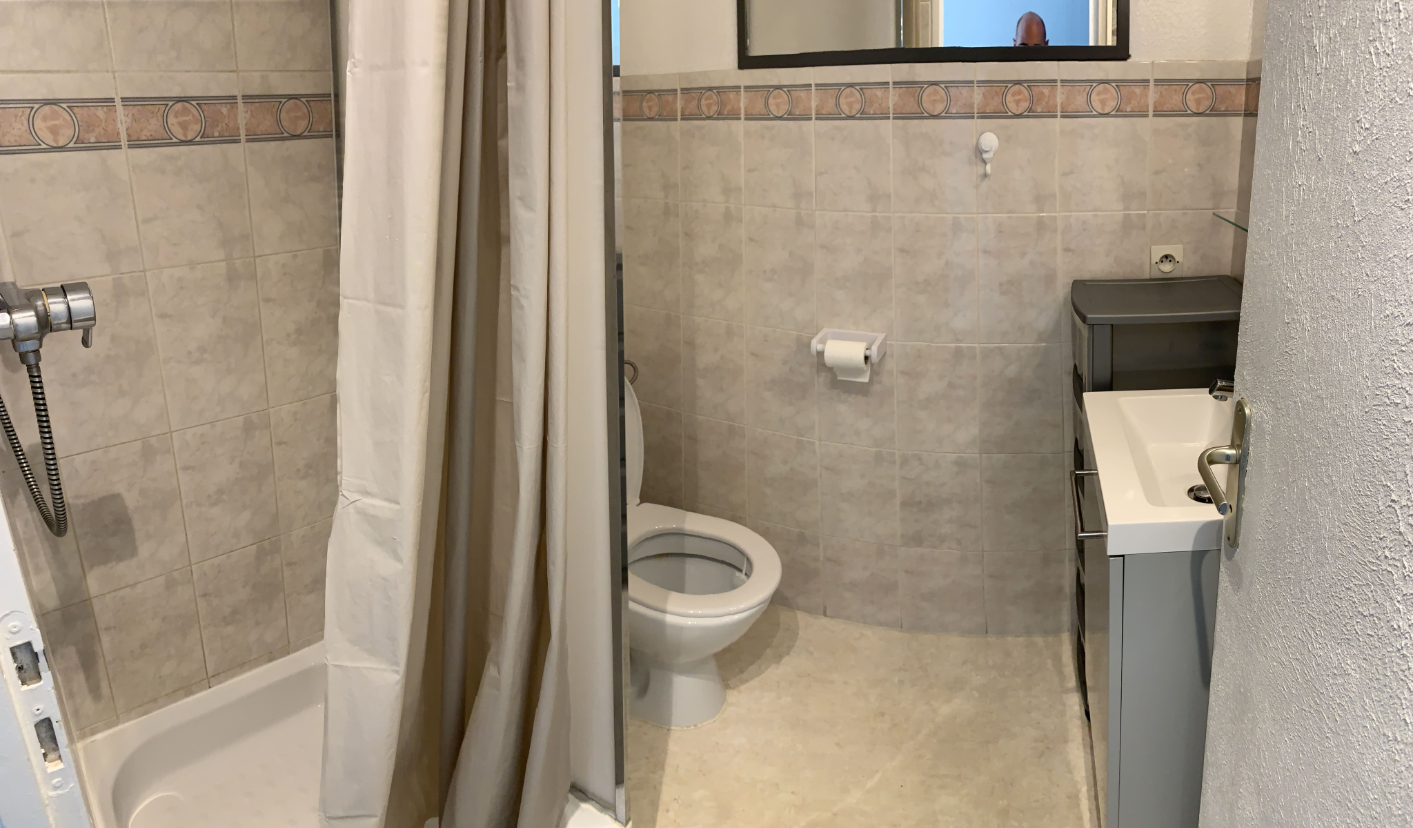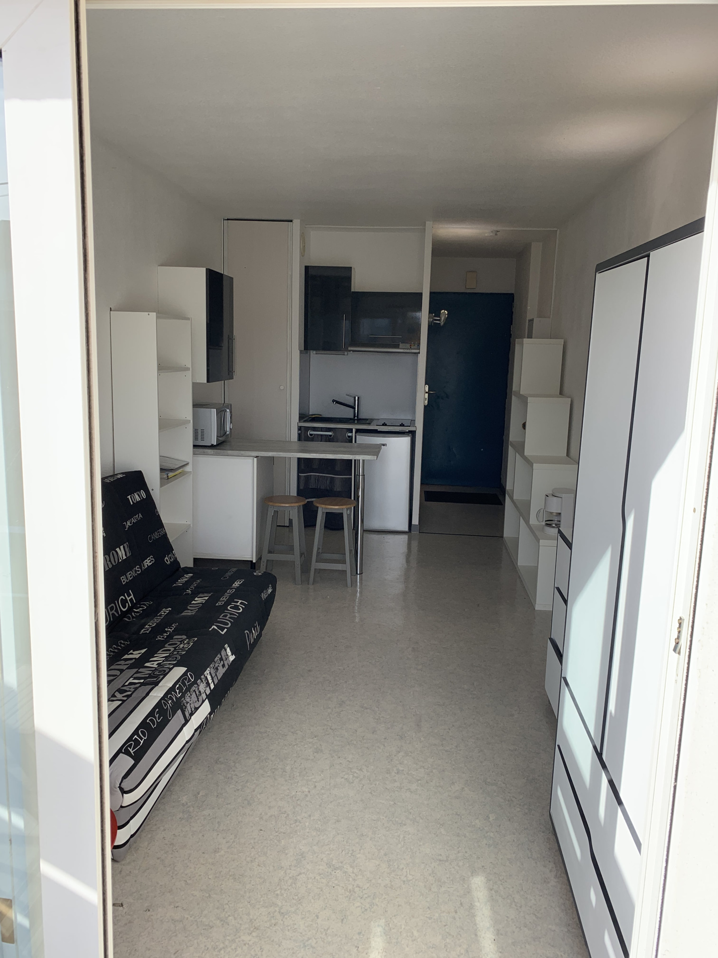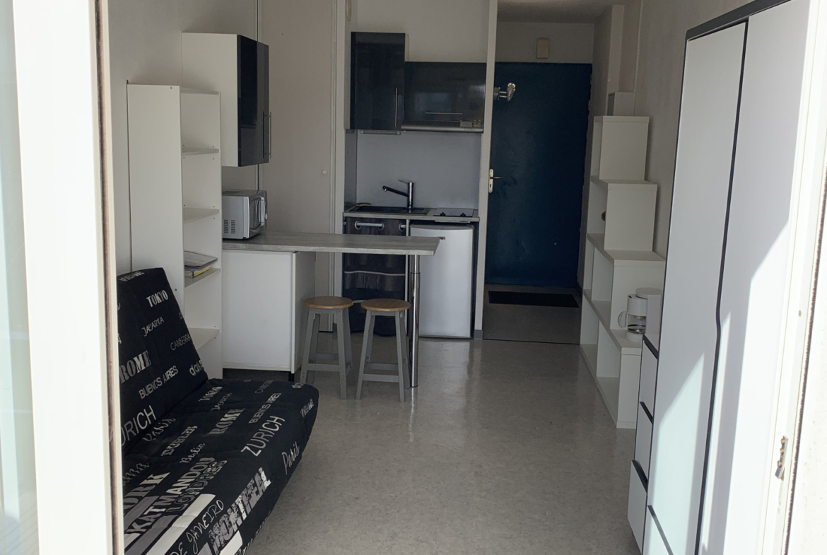 Composé d’une entrée, une salle d’eau avec wc, une pièce de vie avec clic-clac et une armoire, une cuisine équipée avec un coin repas et un balcon.